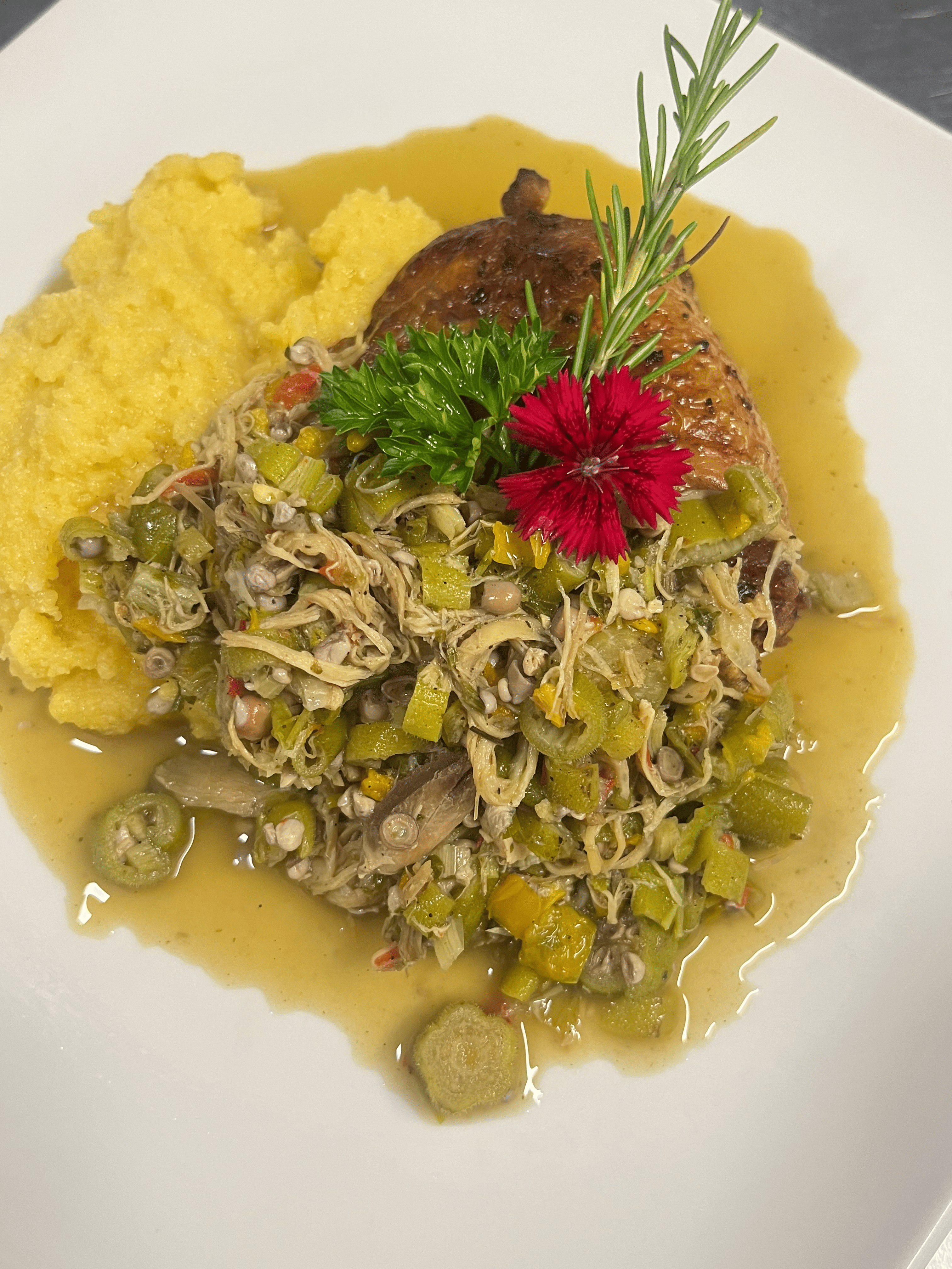 Coxa de frango suculenta, mergulhada em um molho espesso de quiabo